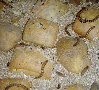 Las larvas las colocaremos en un cajón de plástico, por el que no podrán trepar. De substrato le podemos poner una capa de 4 cm de salvado de trigo, y la distancia de seguridad desde el salvado al filo superior del cajón serán de unos 7 cm mínimo, al colocar las larvas se enterrarán rápidamente para ocultarse y se lo irán comiendo poco a poco. También es bueno ponerles trozos grandes de pan ya que además de comerse la miga, les gusta hacer galerías dentro de él, y si la densidad no es muy alta, nos puparan allí mismo.